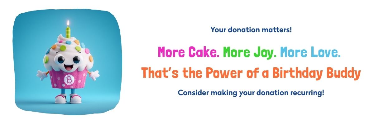Every donation helps us celebrate children whose birthdays might otherwise be forgotten. By becoming a Birthday Buddy and making your gift recurring, you help ensure that every child gets their special day, all year long.